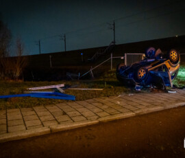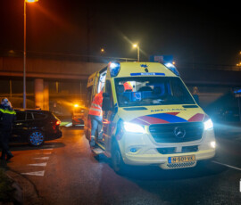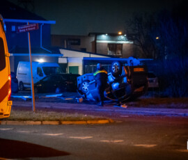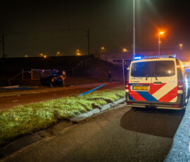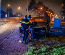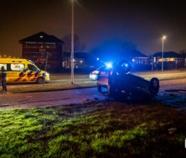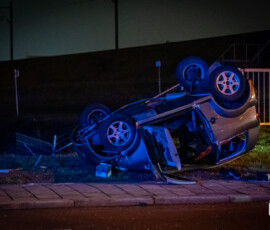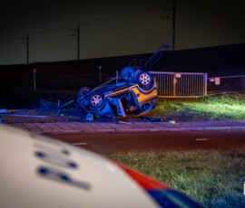 Op de 1e Barendrechtseweg in Barendrecht is een brommobiel door nog onbekende oorzaak van de weg geraakt en op zijn kop terechtgekomen na een eenzijdige aanrijding.