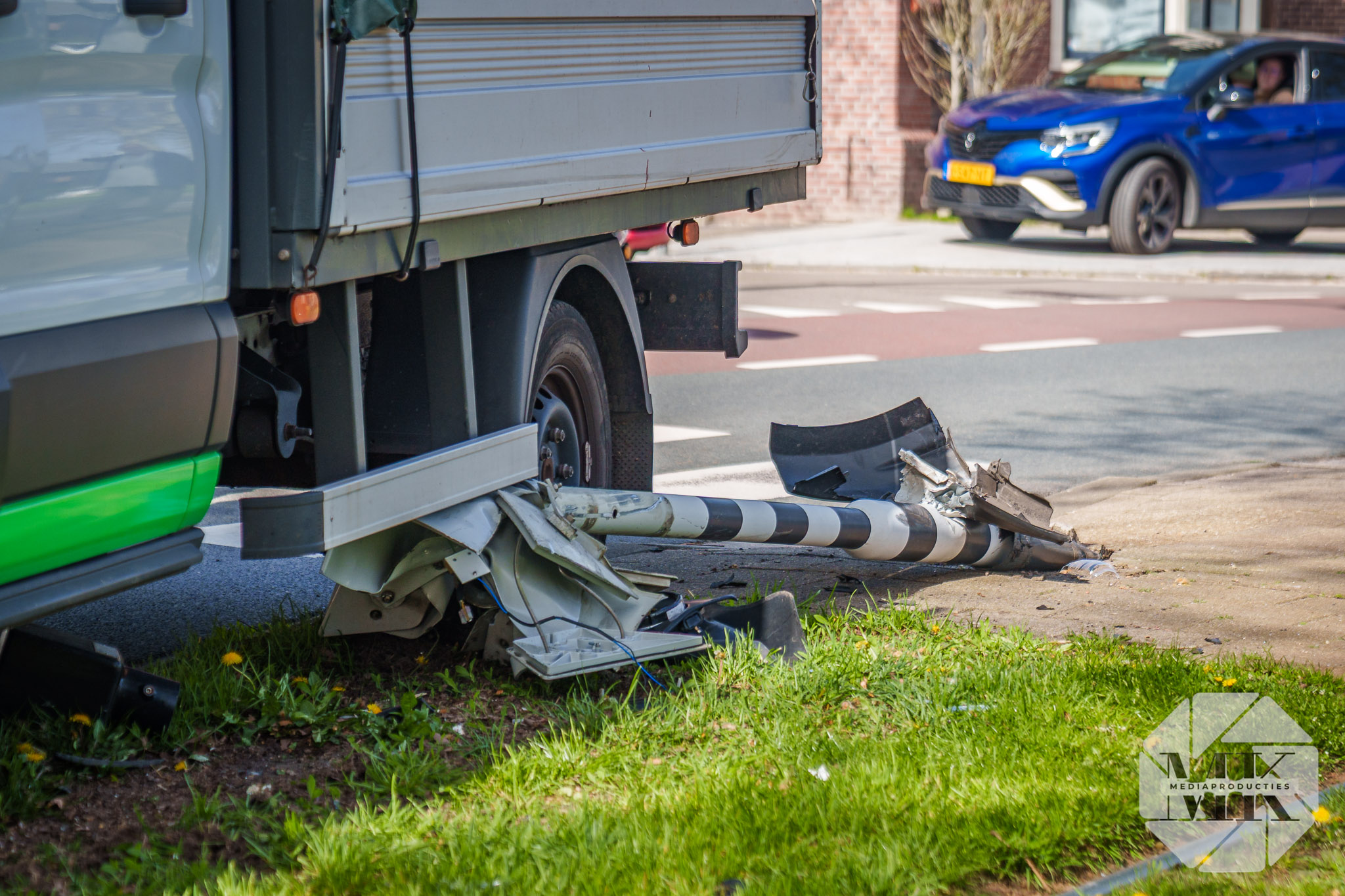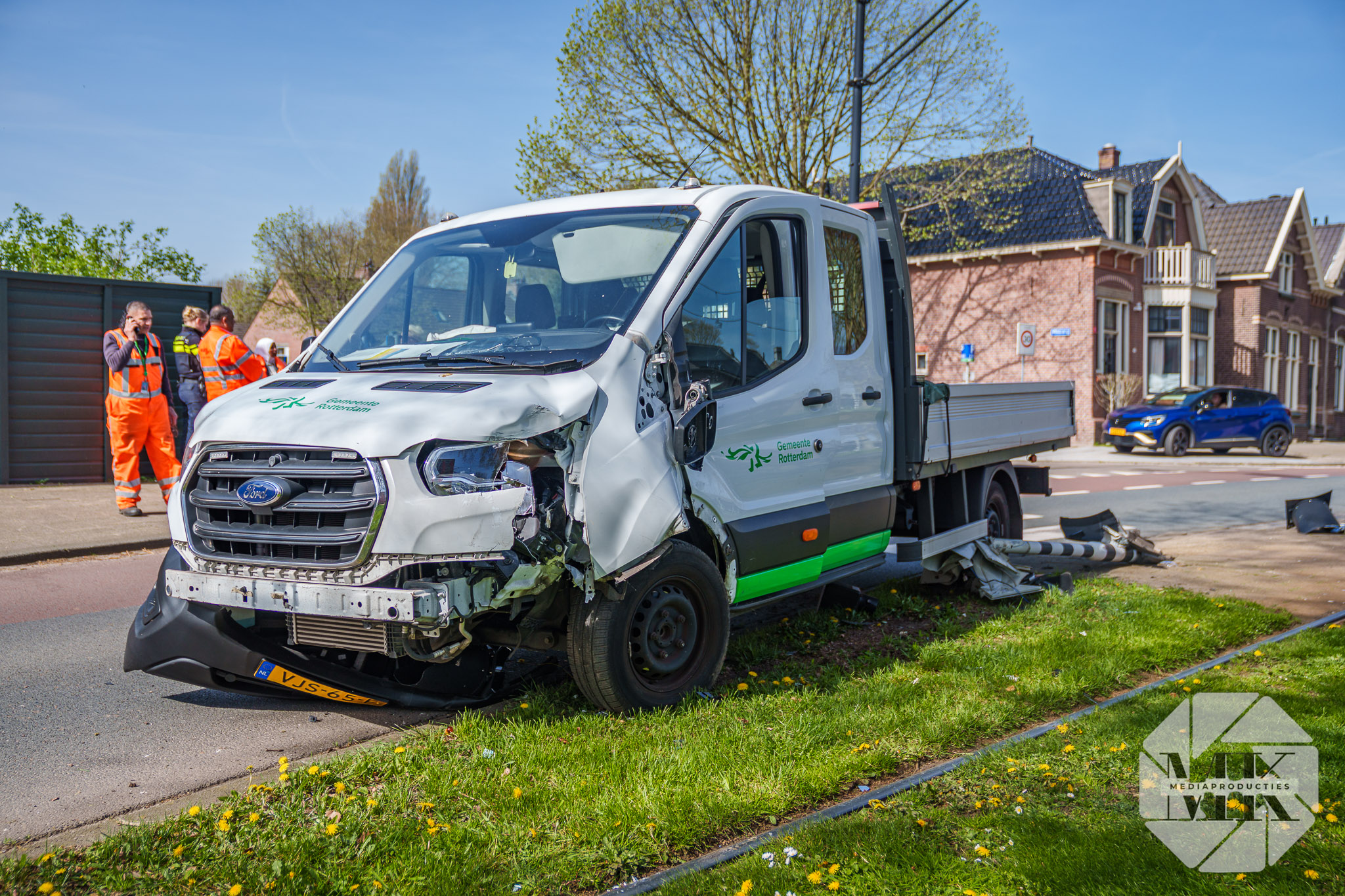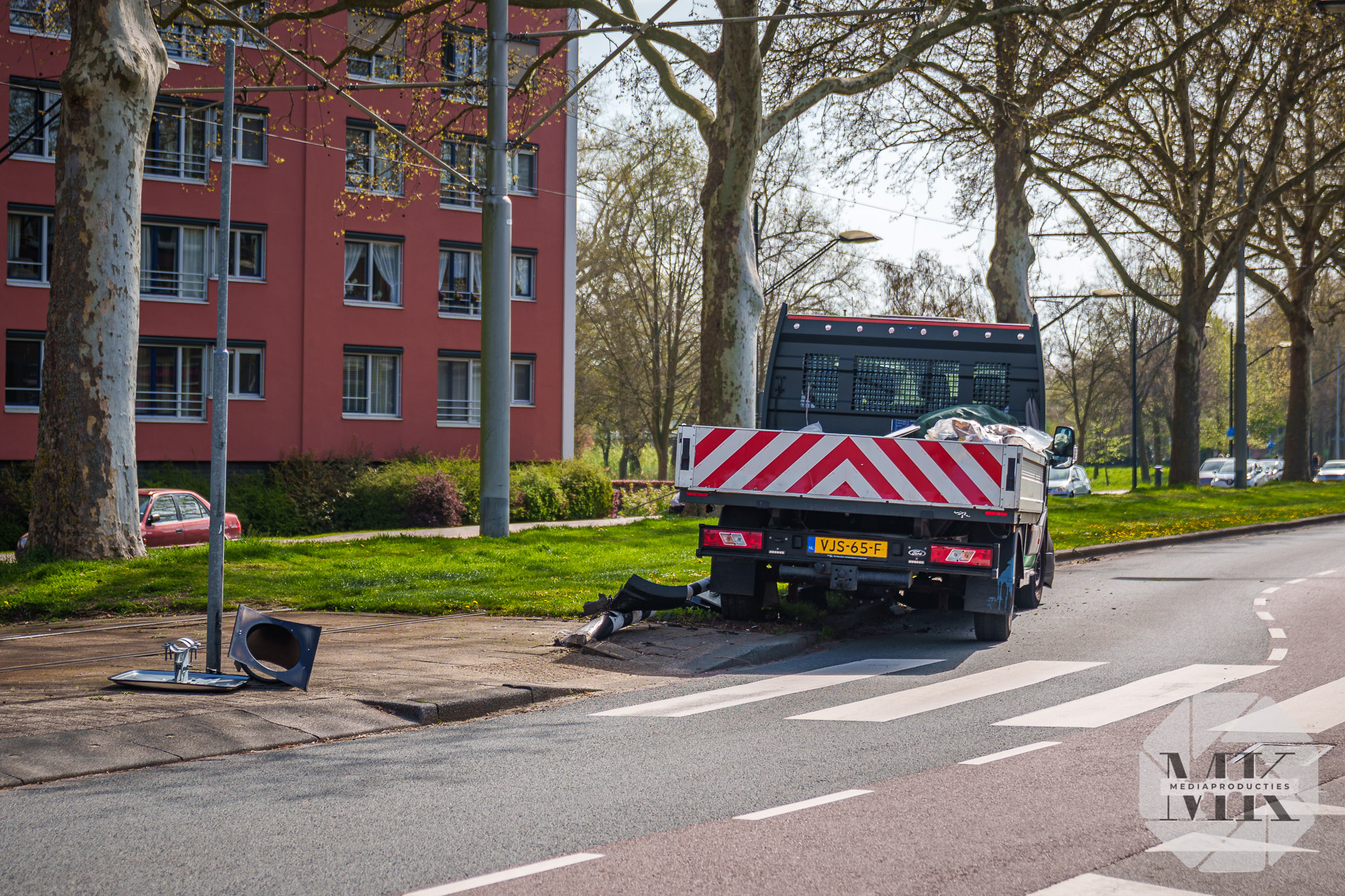 Rotterdam – Een gemeentewagen is bij een eenzijdig ongeval tegen een paal van een tramovergang gereden aan de Dordtsestraatweg in Rotterdam. De paal kwam los en ligt onder het voertuig.