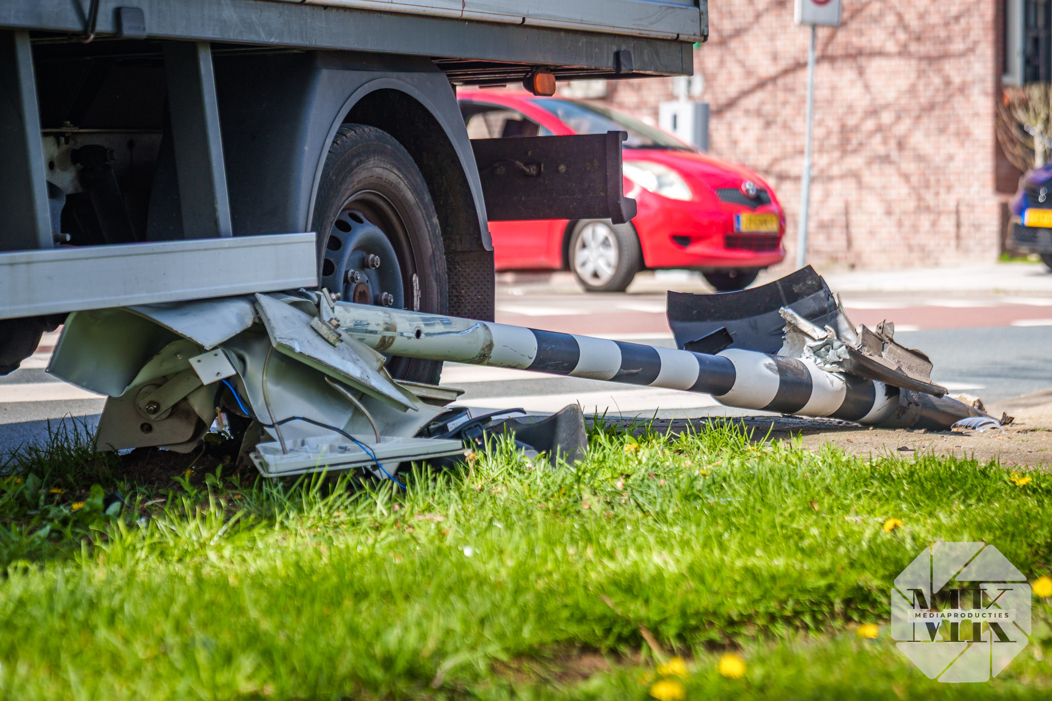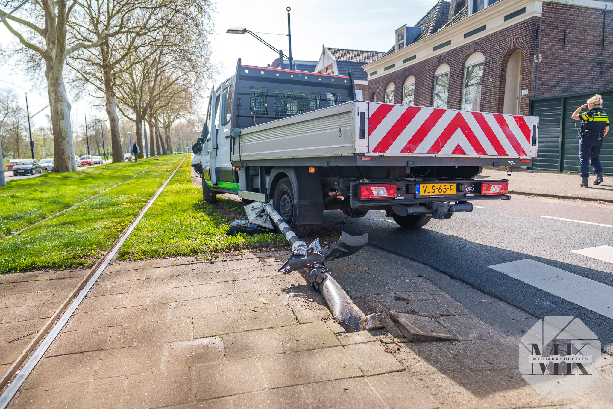 Het voertuig botste hard tegen de paal bij de tramovergang. Door de impact schoot de paal uit de grond en belandde onder de auto. De airbags zijn uitgegaan en de voorkant van het voertuig liep zichtbare schade op. Politie zette de locatie af en zorgde voor een veilige situatie rond het voertuig.