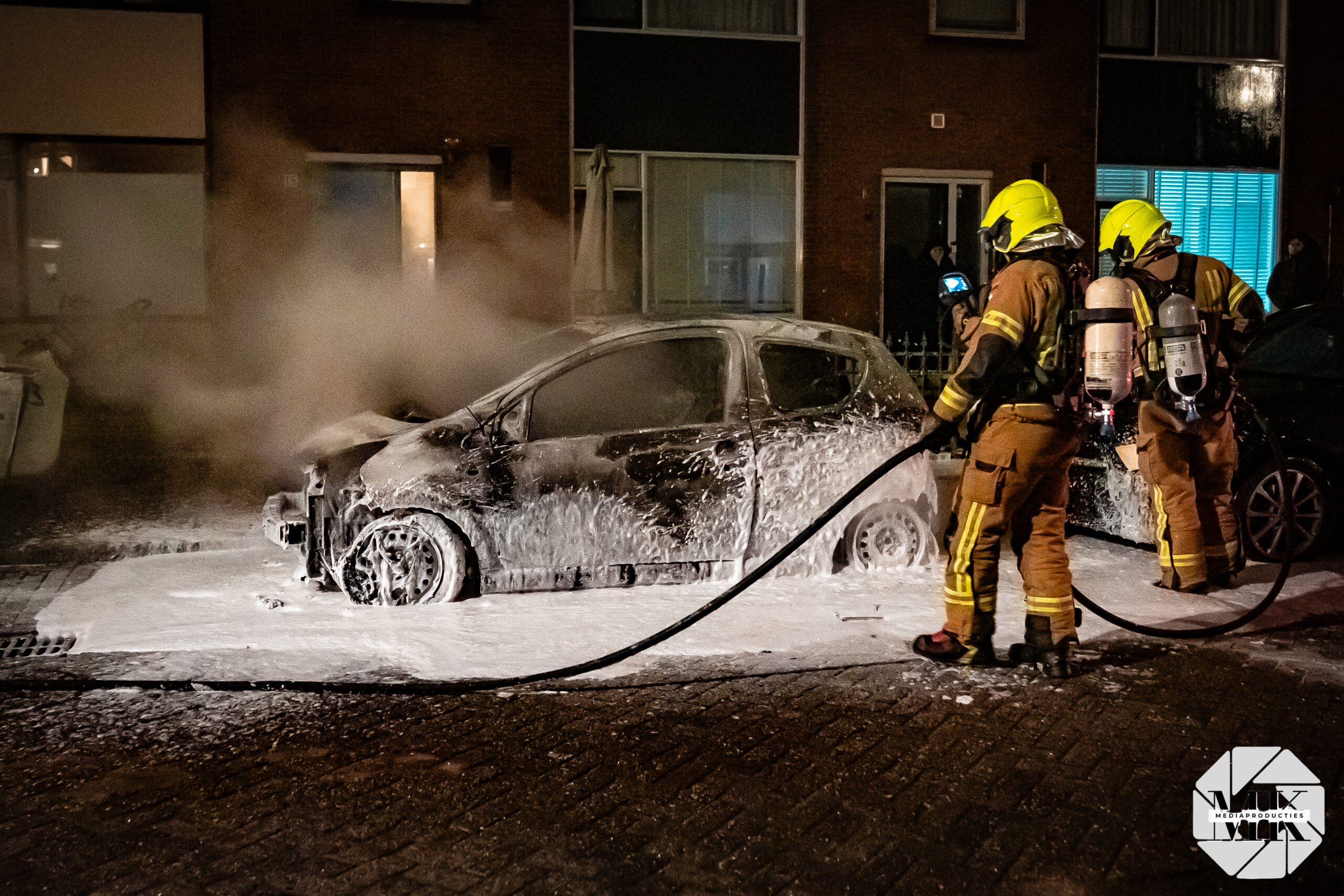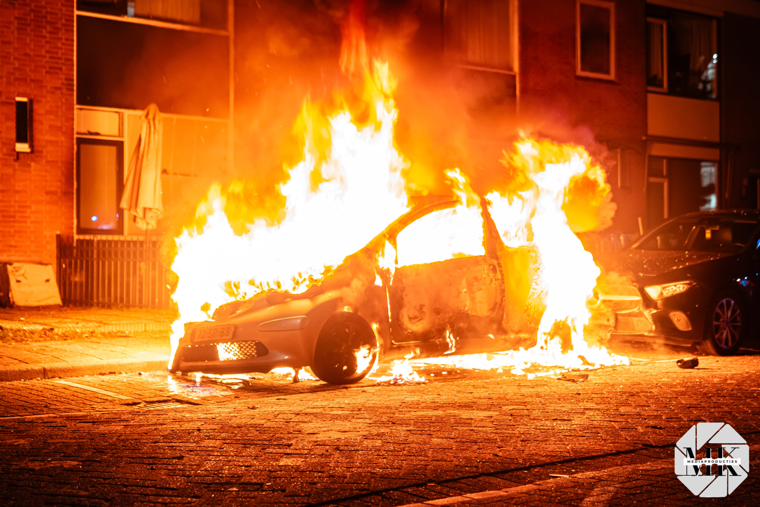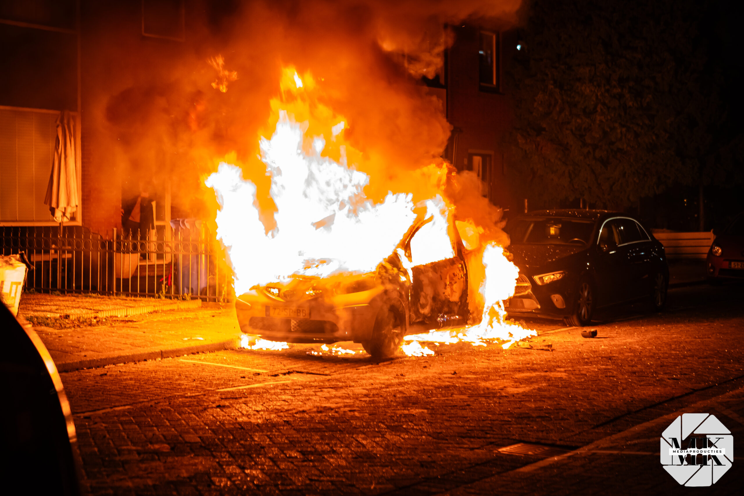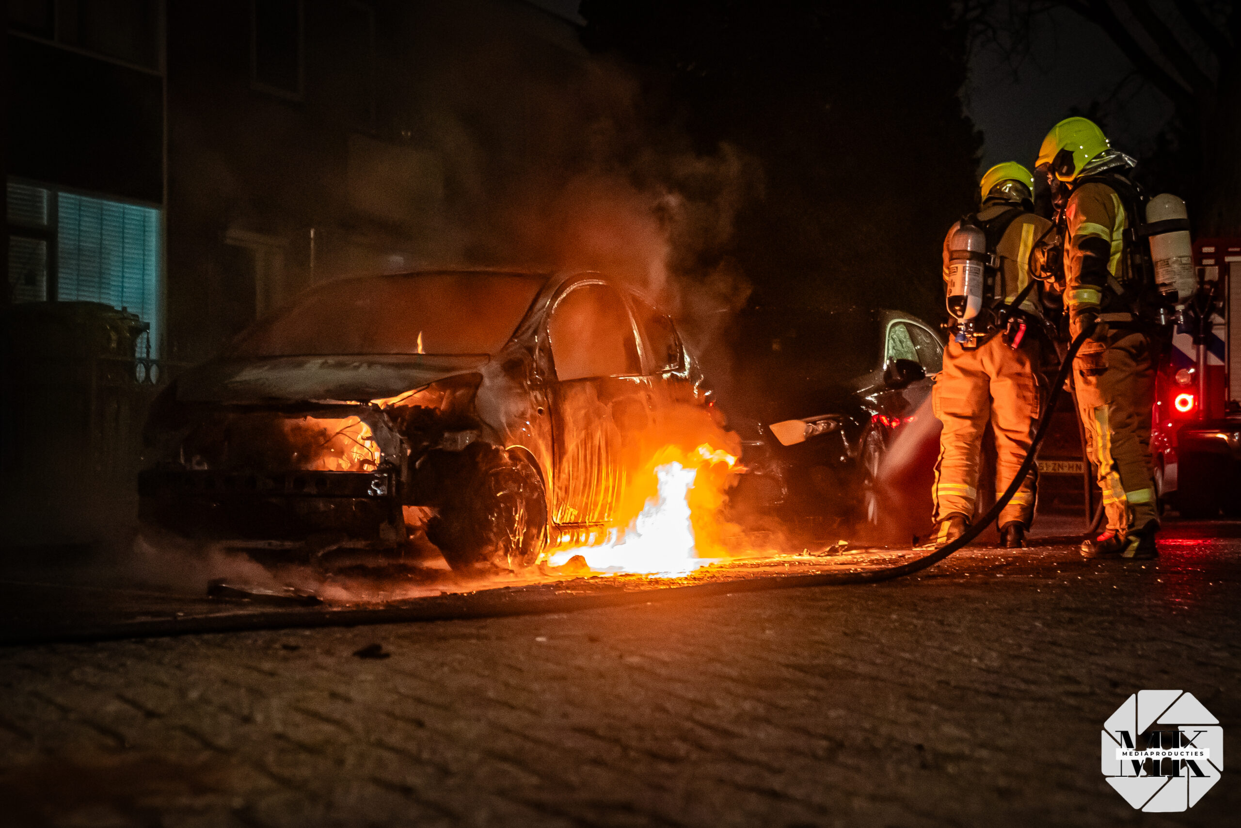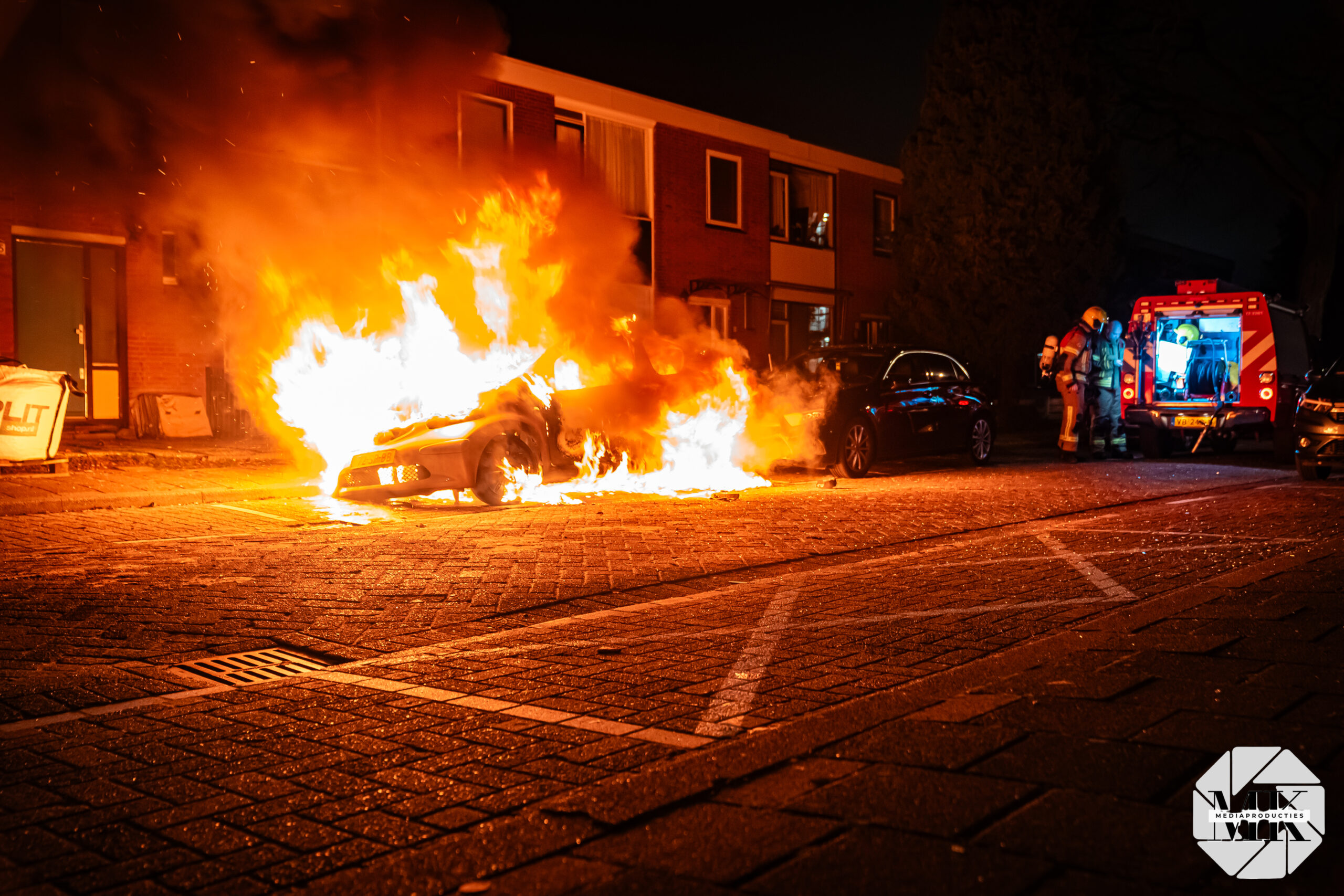 Voor aankomst van de brandweer stond de auto al in lichterlaaie. Aan de voorzijde waren blauwe vlammen zichtbaar, wat duidt op verbranding van brandstof. De brand was zo heftig dat een extra brandweervoertuig is ingezet voor aanvullende watervoorziening.