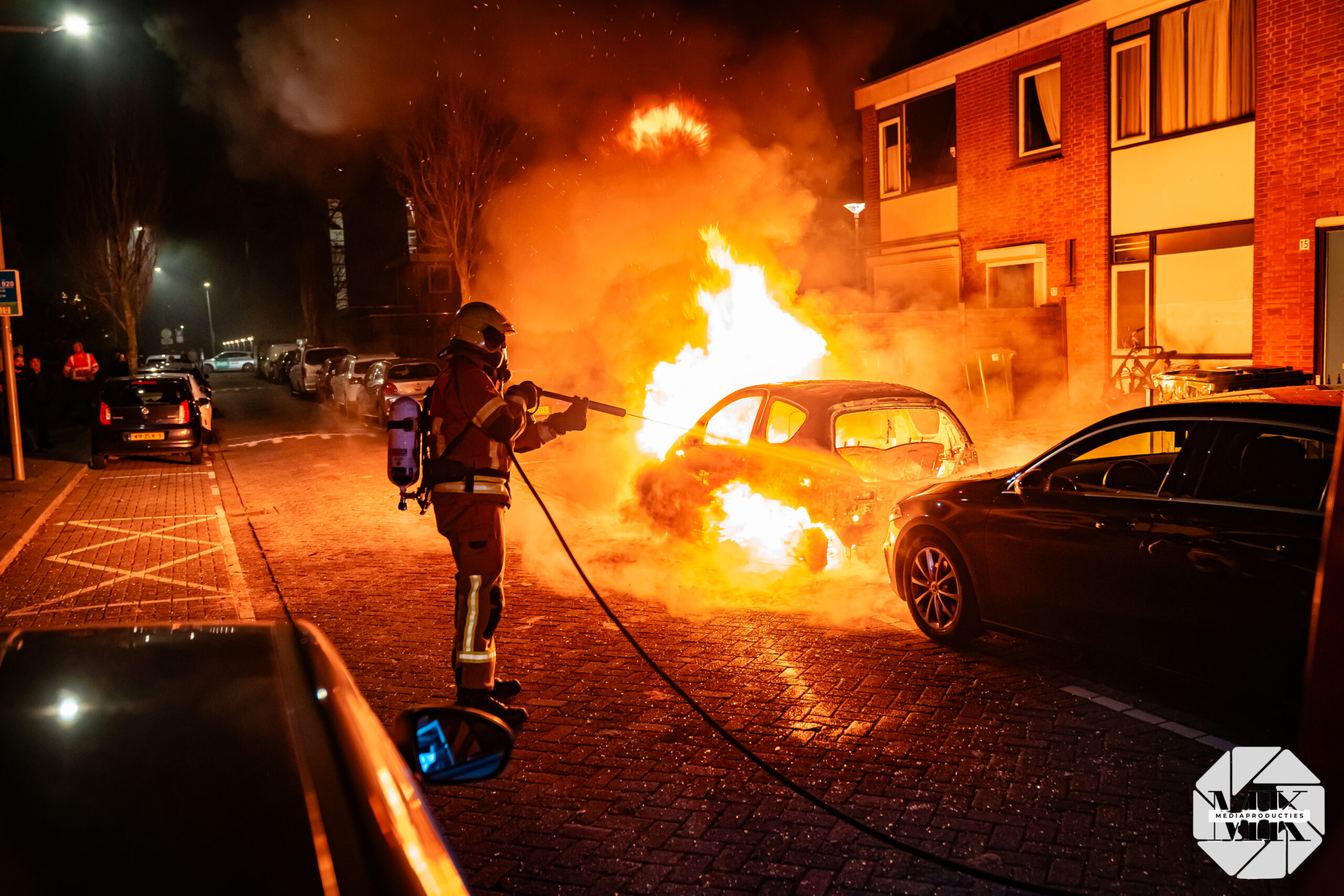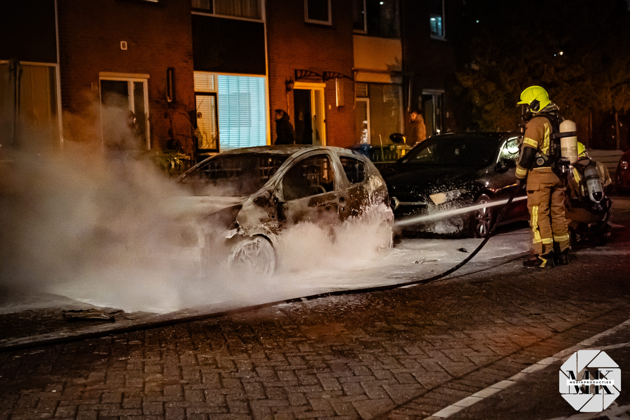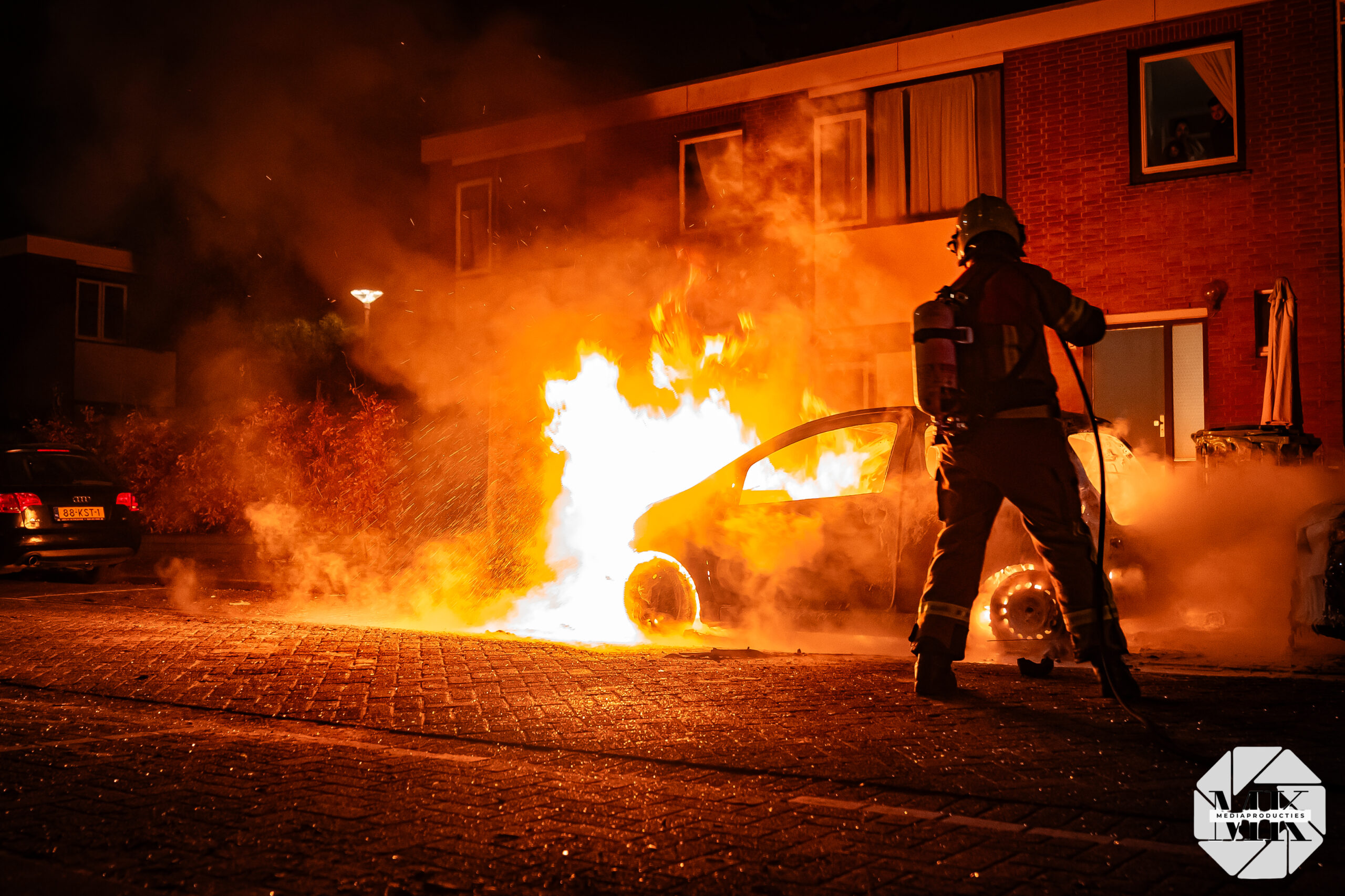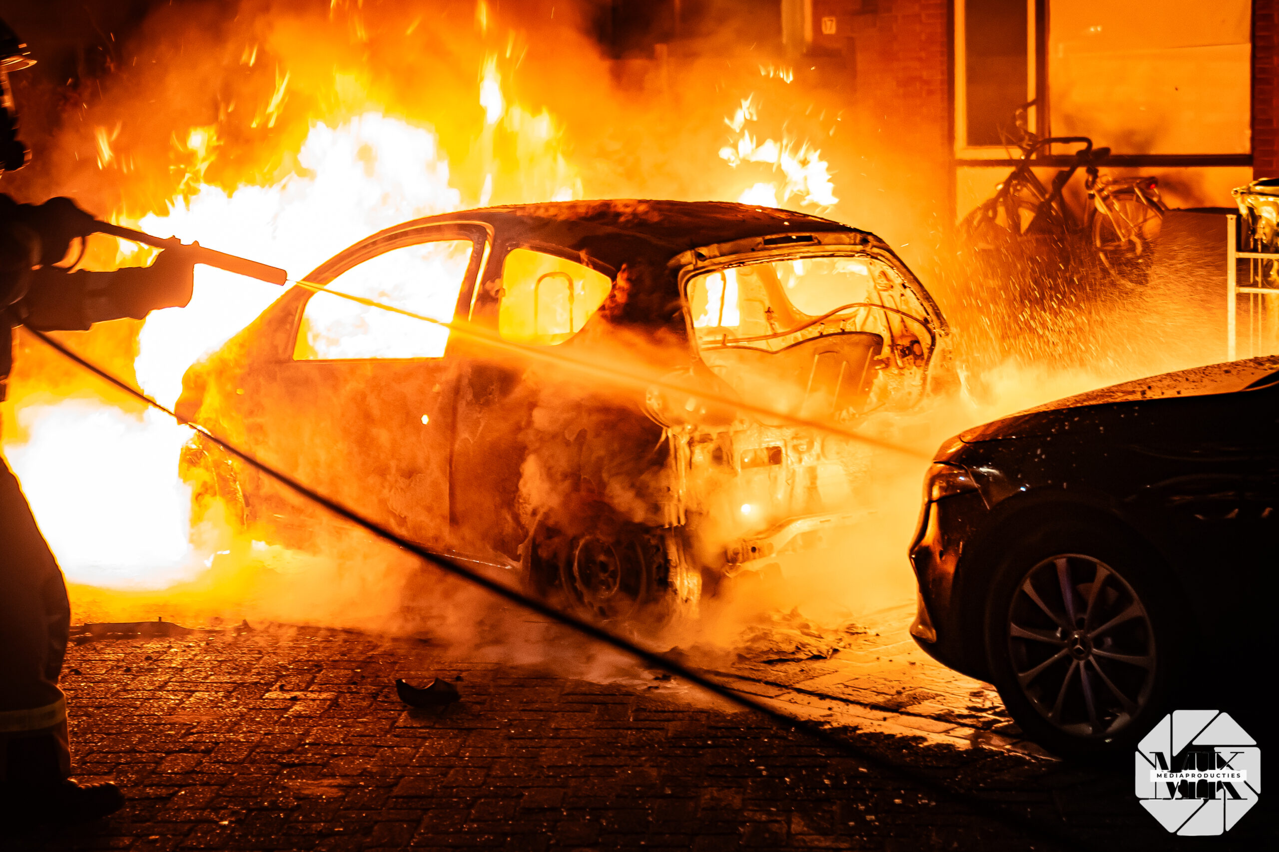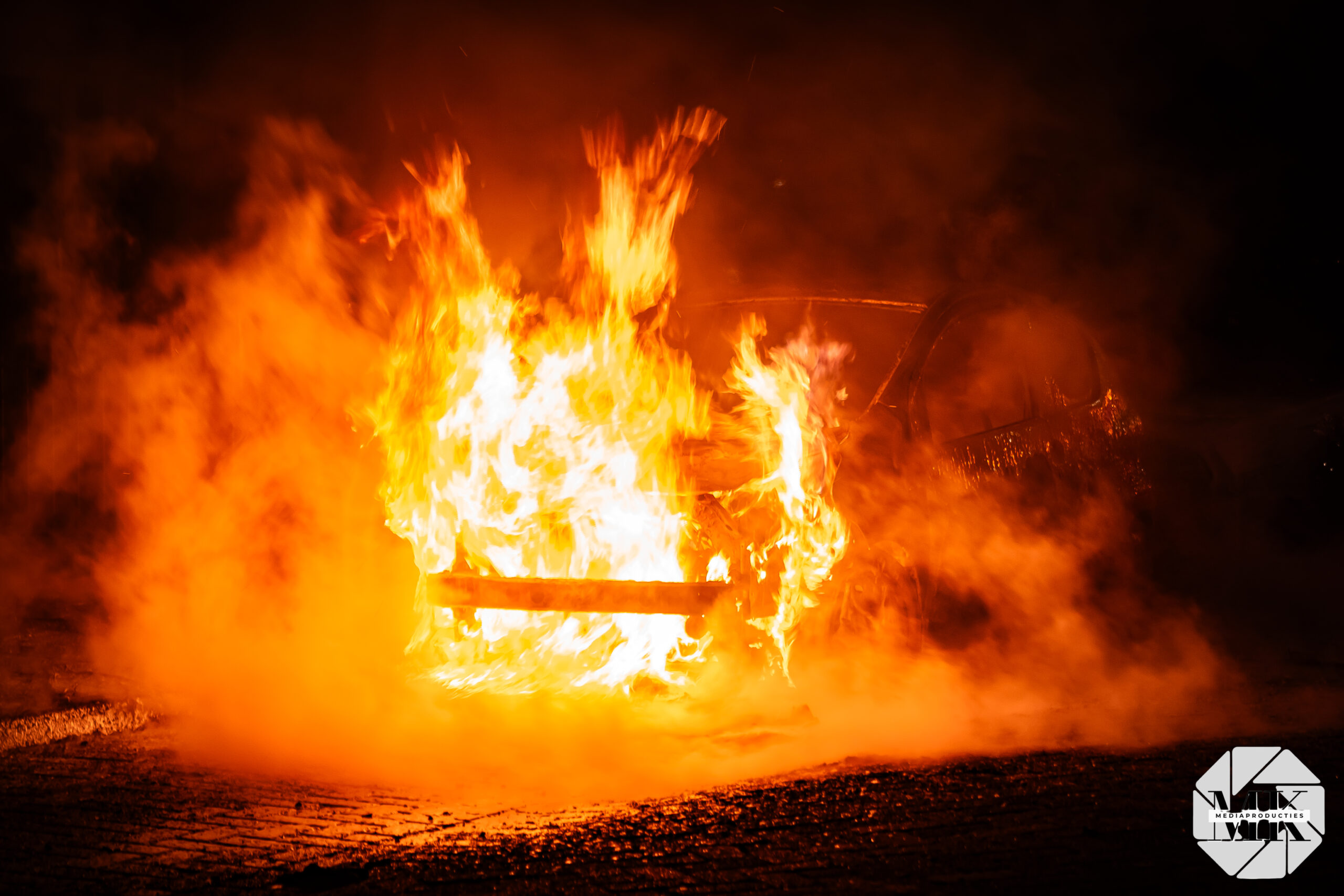 Voor aankomst van de brandweer stond de auto al in lichterlaaie. Aan de voorzijde waren blauwe vlammen zichtbaar, wat duidt op verbranding van brandstof. De brand was zo heftig dat een extra brandweervoertuig is ingezet voor aanvullende watervoorziening.