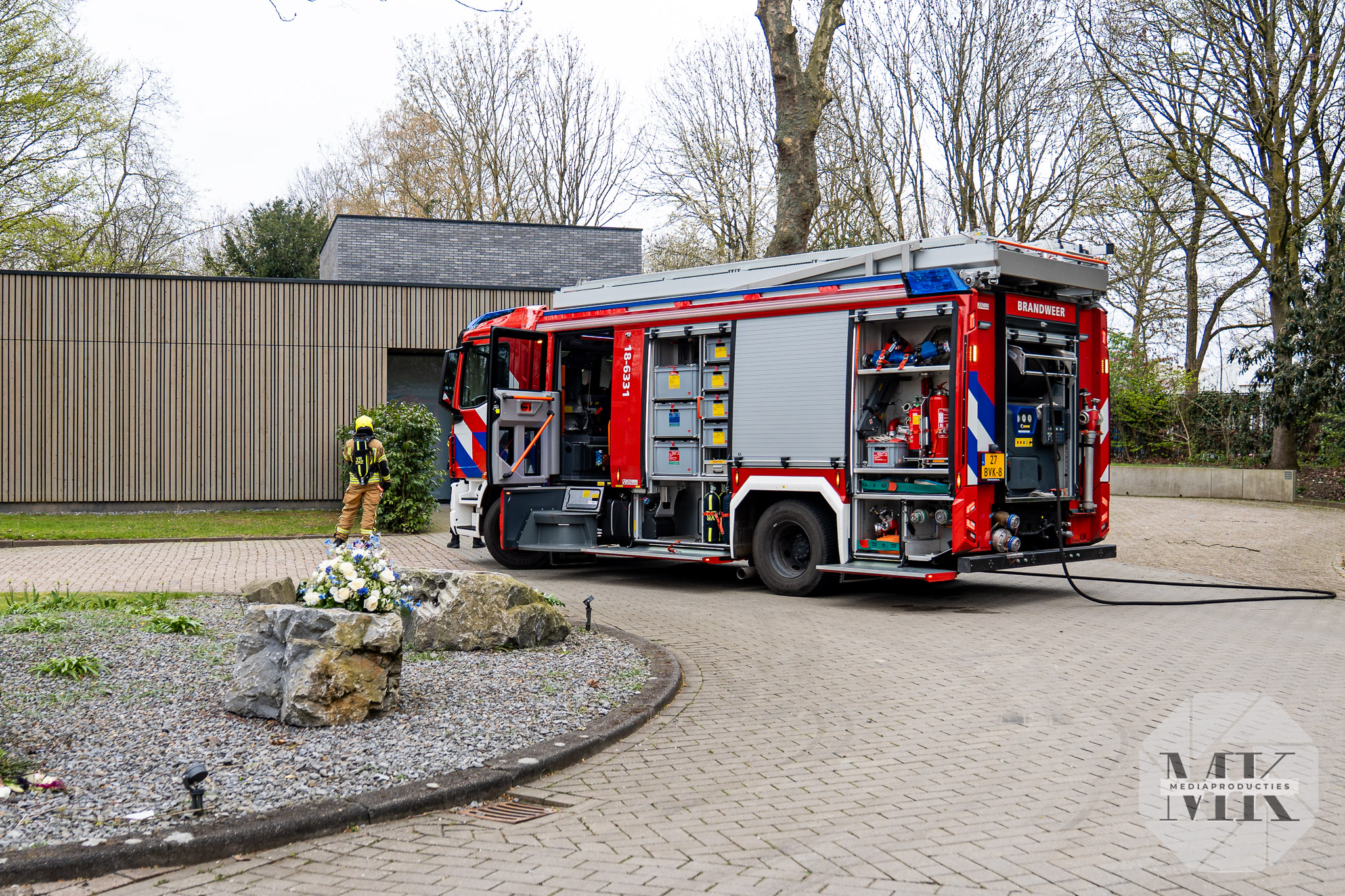 Binnen stond de oveninstallatie in brand en hing een dichte rooklaag. Bij de entree was de rook duidelijk zichtbaar. Brandweerlieden gingen het gebouw in, controleerden de installatie en richtten zich op het voorkomen van uitbreiding. De situatie werd gestabiliseerd en verdere schade beperkt.