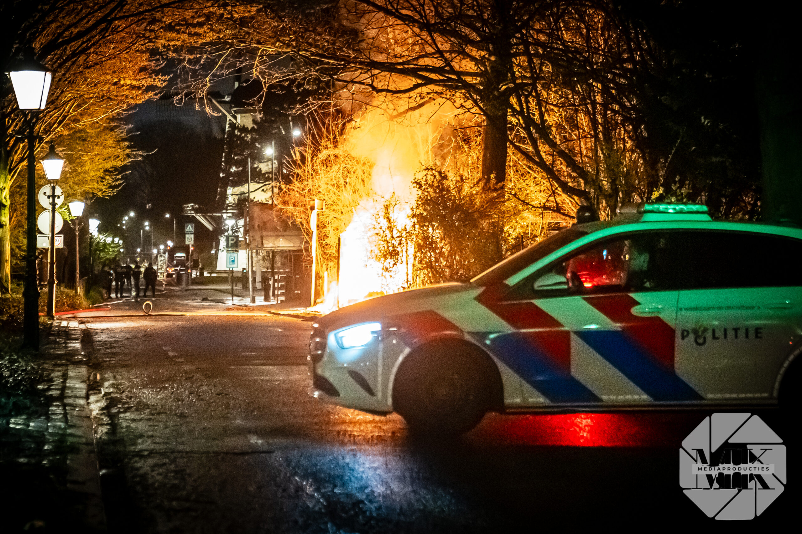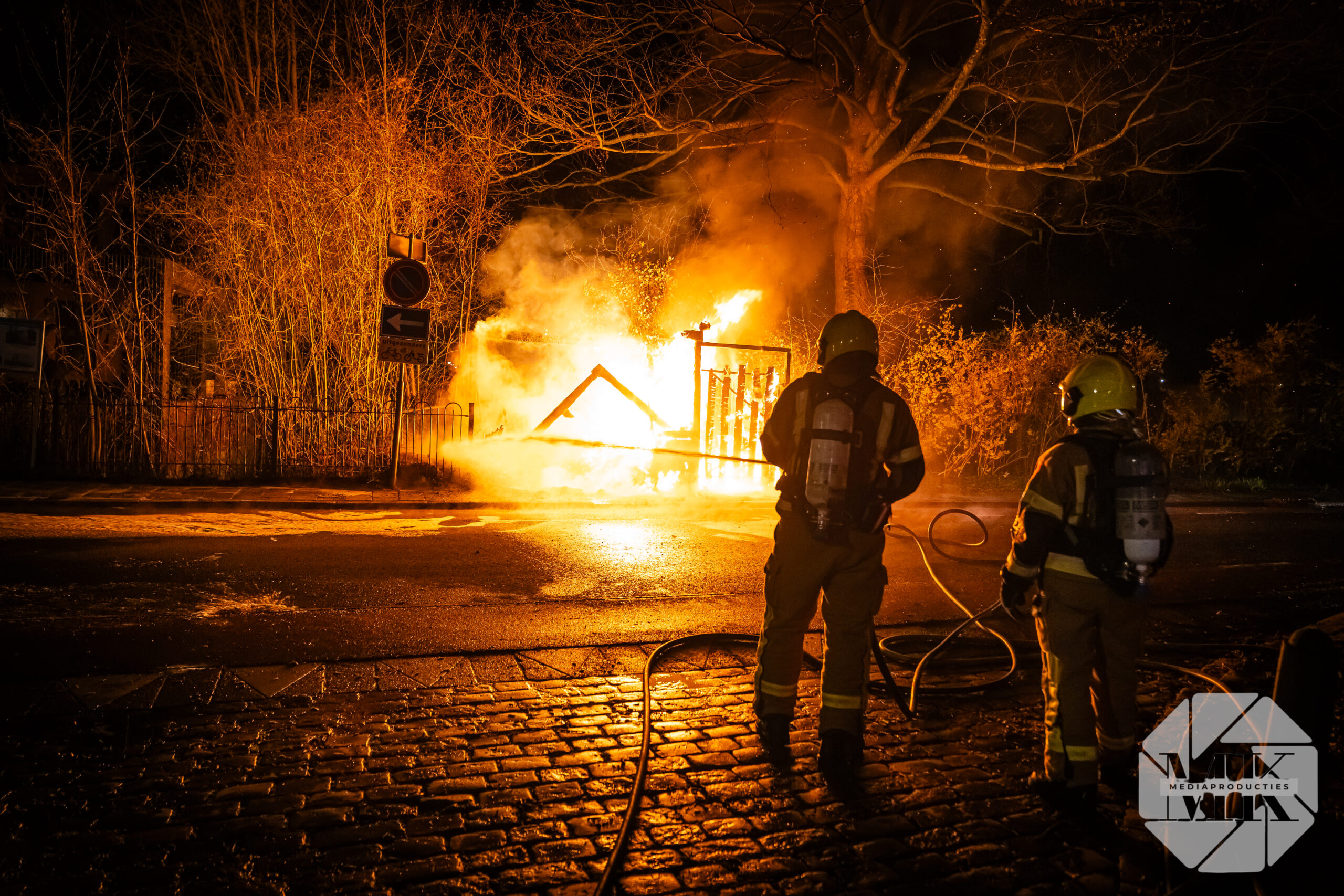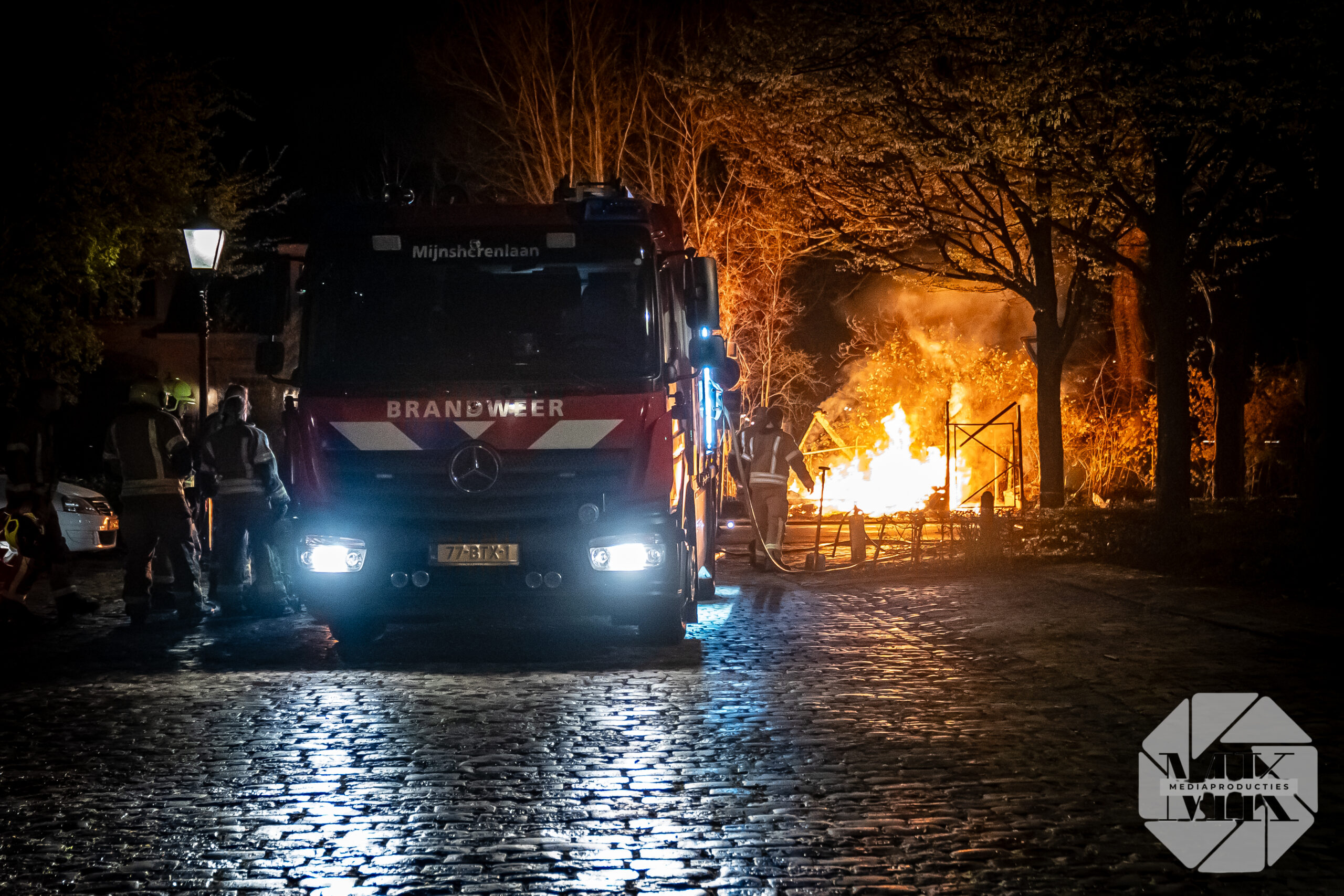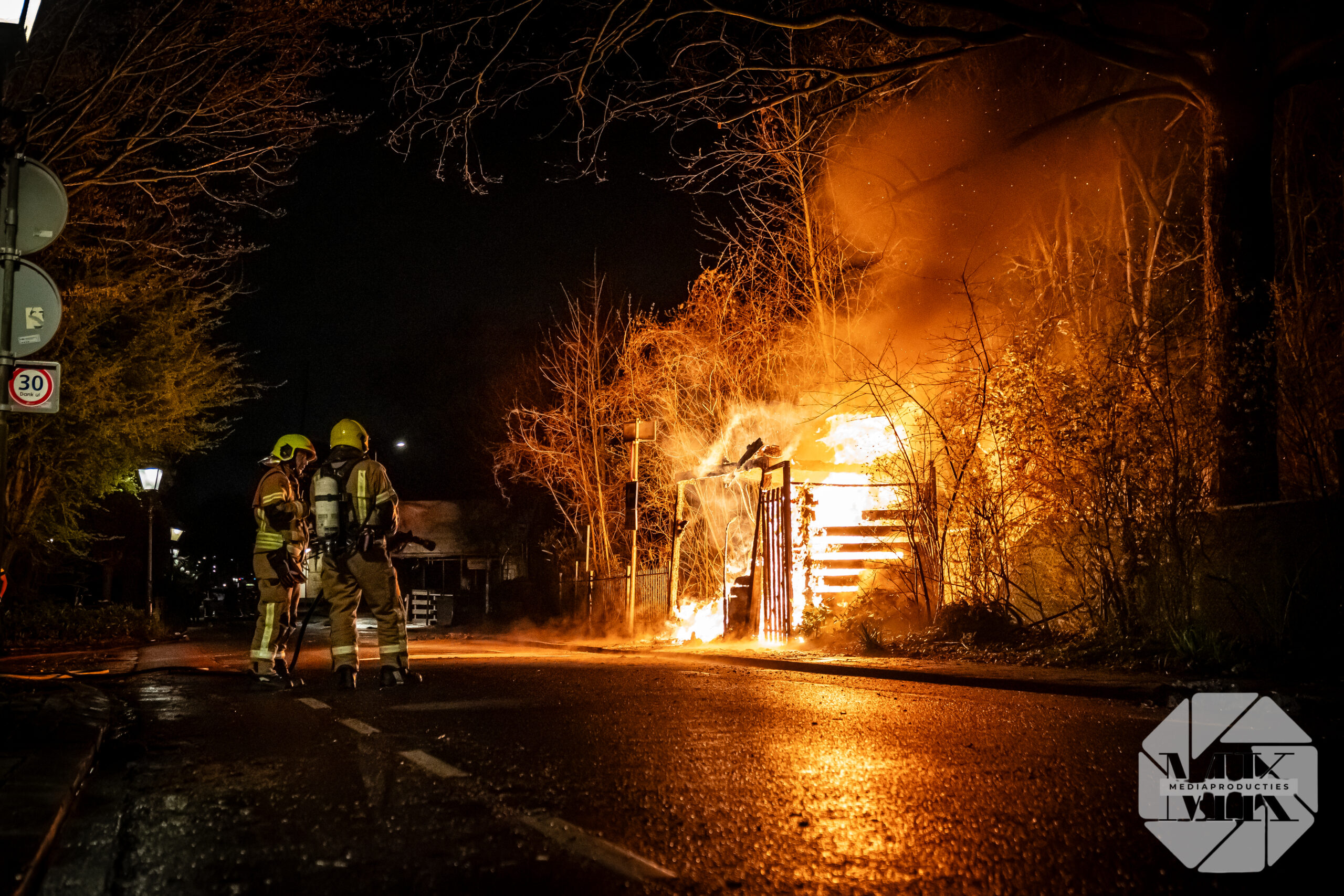 Brandweervoertuigen stonden rond de schuur opgesteld en zetten in op blussen met extra materieel, waaronder een schuimblusvoertuig. In de opslag lagen vermoedelijk gevaarlijke stoffen, waardoor de inzet complex werd. De brandweer probeerde het gebouw te behouden maar moest die poging staken en liet de schuur gecontroleerd uitbranden.