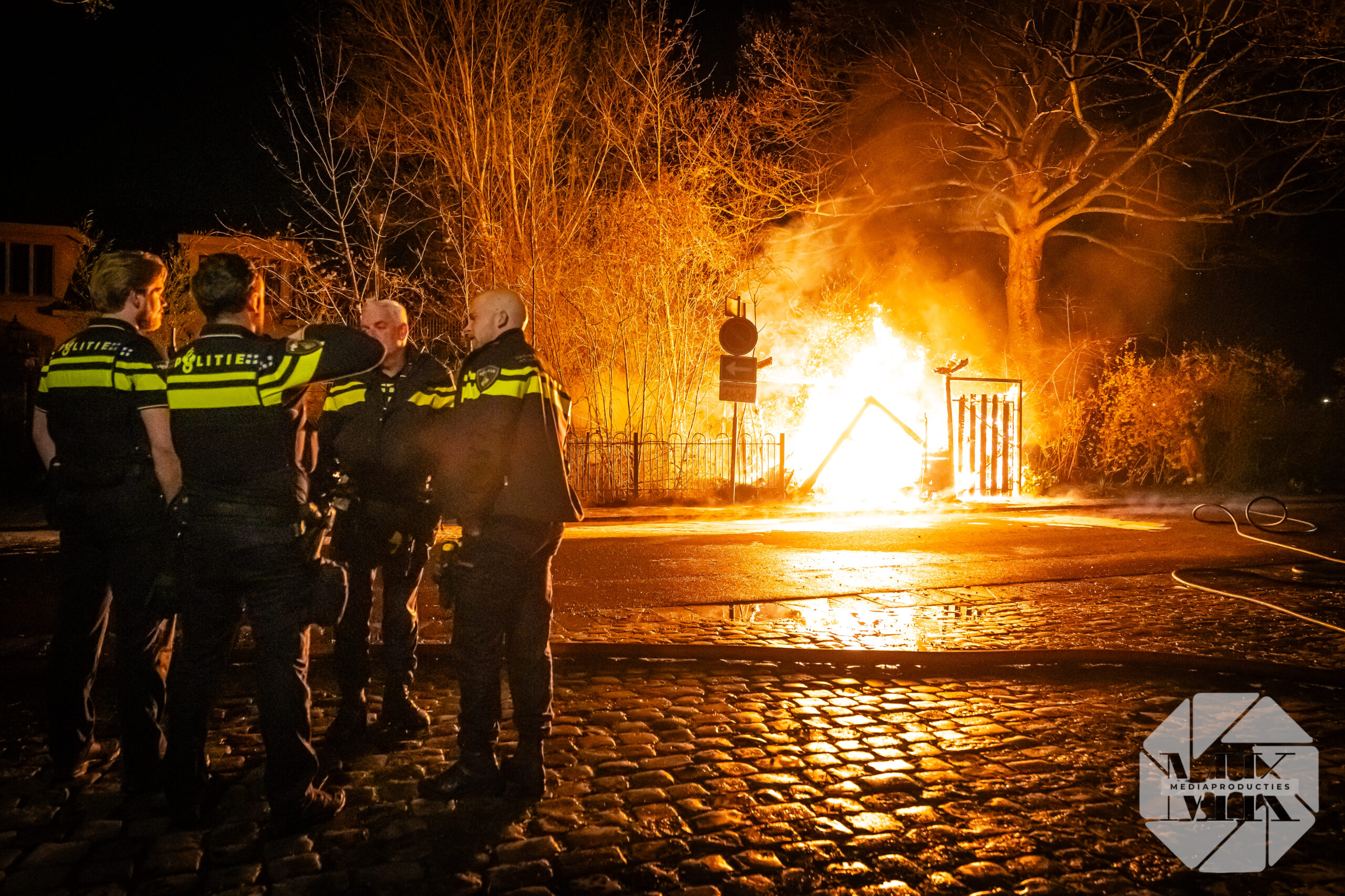 Op de stoep lag een zichtbaar brandspoor dat vanaf de schuur liep. De politie heeft het terrein afgezet en doet onderzoek naar mogelijke brandstichting. Na afloop controleerde de brandweer de resten van de schuur.